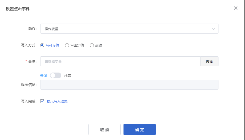 绑定可读写变量,可实现对变量“写可设值”“写固定值”,以及“点动”操控,如下图