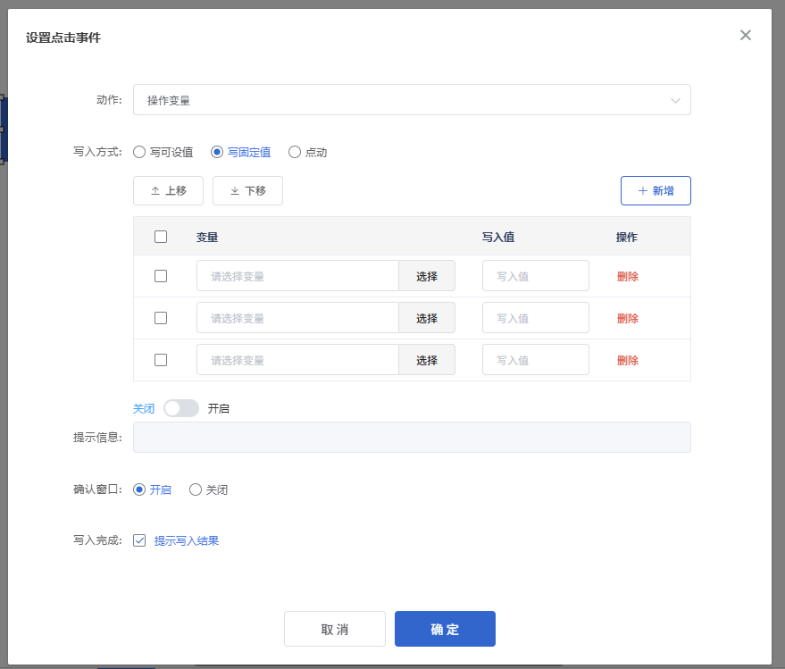 支持选择单个或多个变量,实现写入固定的数值,适合对设备的固定开关进行固定模式的操作,举例:设置阀门的固定数值,实现开启/关闭