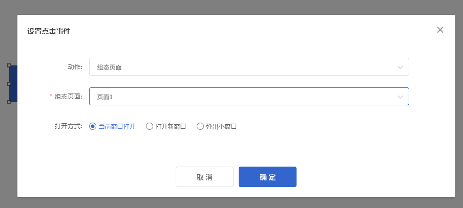 设置同设备的其他组态页面,实现页面跳转。跳转模式可设置为在当前页刷新、新网页展示或子窗口展示。如图