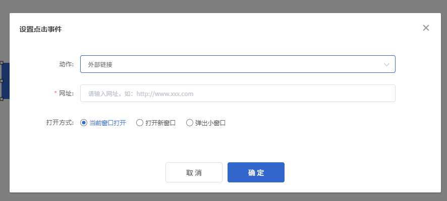 设置点击打开外部链接网页,可以选择打开方式,如图 ,支持在当前窗口、新窗口,或小窗口中打开