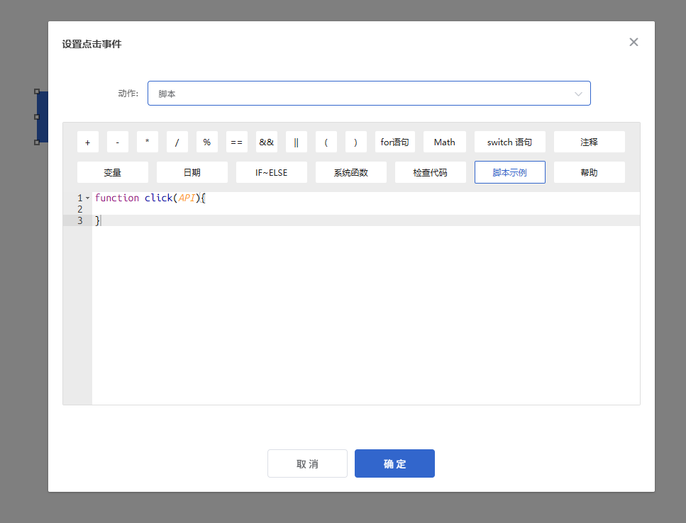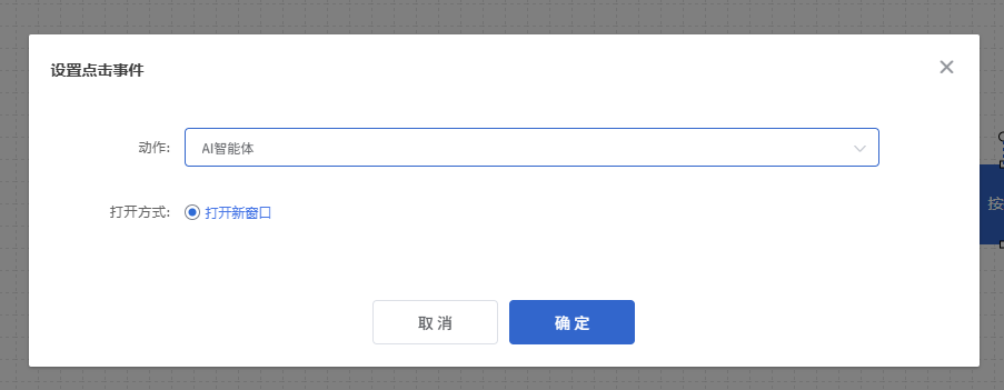 单击事件可实现操作变量、打开功能页面,跳转组态页面、修改变量配置、跳转外部链接、执行脚本五种功能、设置AI智能体、设置系统变量(低功耗网关类设备)等功能