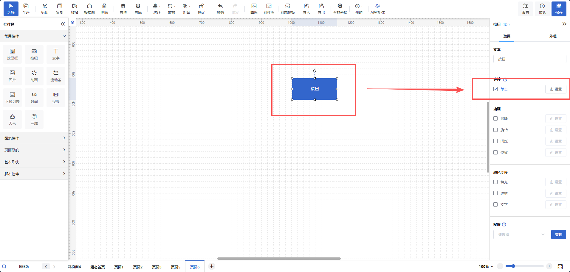 单击事件功能是指通过点击控件实现远程操控,进行页面跳转等操作,具备单击事件的控件有:【数显框】、【按钮】、【文字】、【图片】、【动画】、【下拉框】