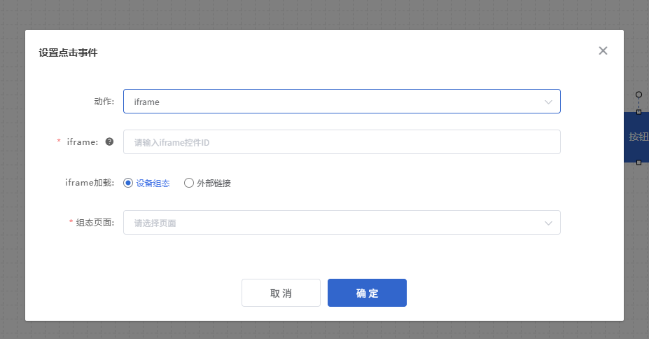 支持通过点击事件,设置组态内的ifram框架的响应事件,可设置点击按钮,在ifram中加载某个组态页面或外部链接,实现类似于在不跳转页面的前提下,在同一个页面切换不同的内容