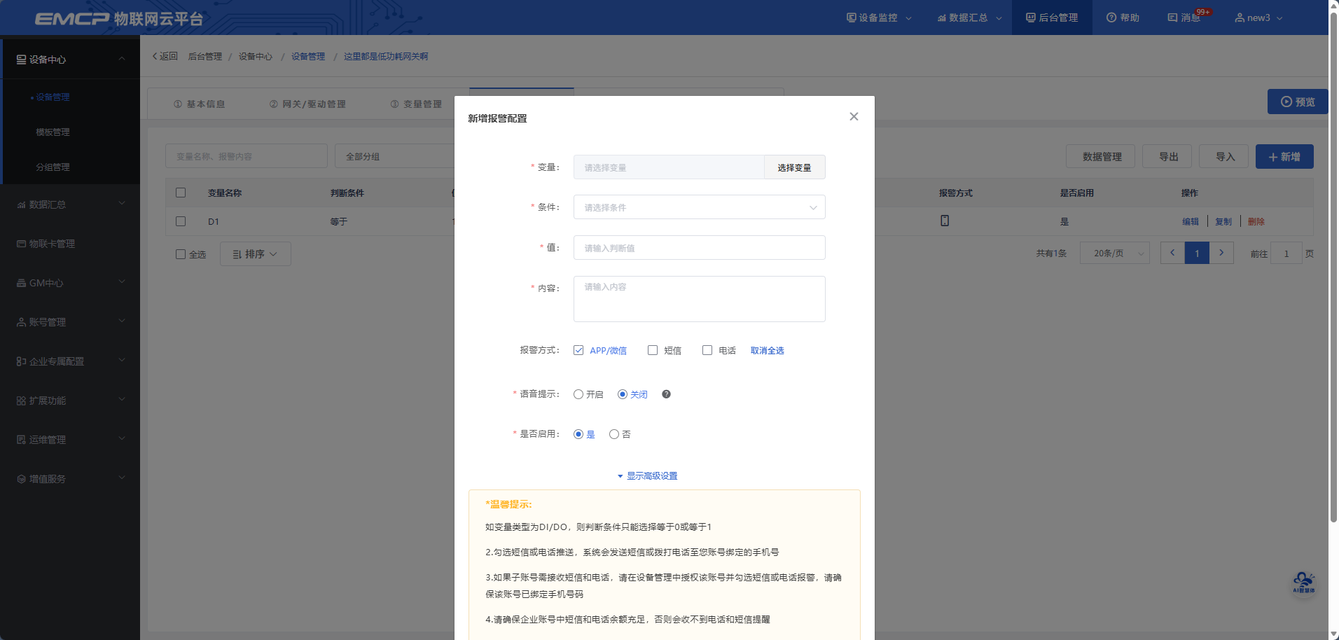 低功耗类的网关,在设置报警功能中,基本与EG类网关类似,可以选择对应的变量,设置报警条件来触发报警,但针对于低功耗网关类设备,有如下区别: