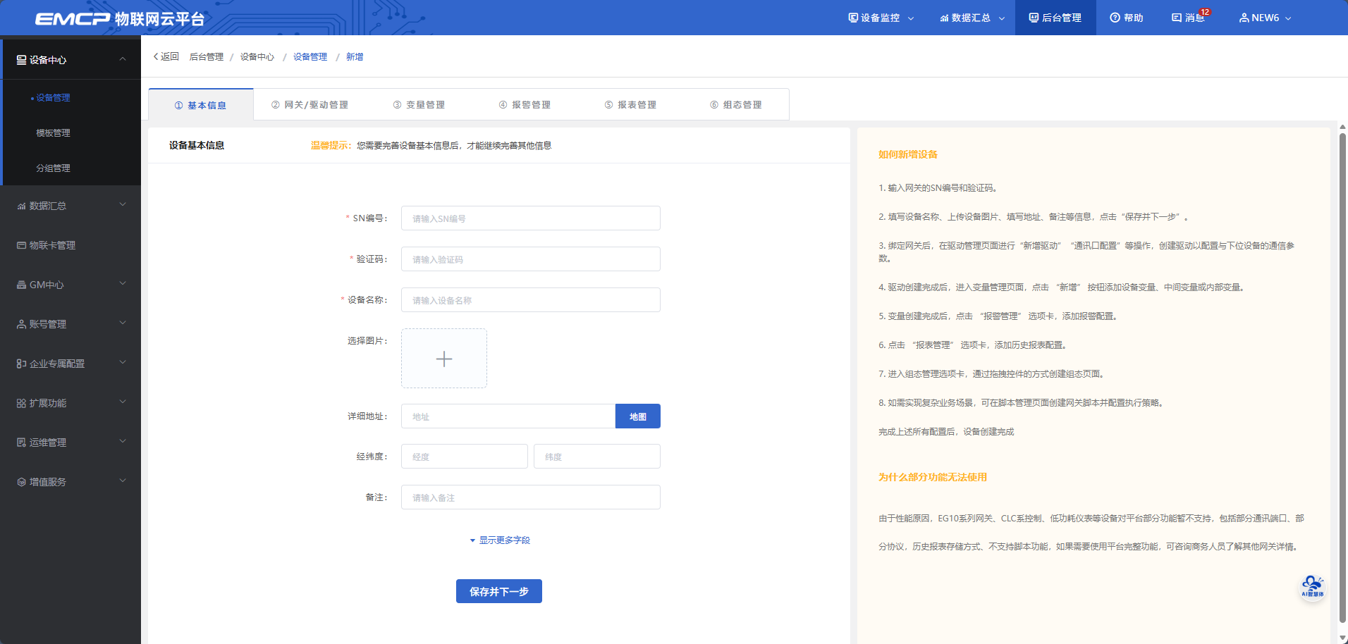 需要先完成【步骤①:设备基本信息】的必填项,并点击【保存】后,才能设置后续的步骤。