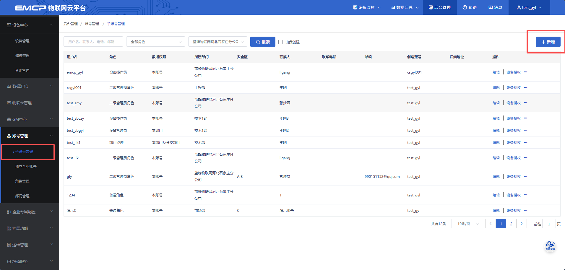 点击顶部菜单【后台管理】,进入【后台管理】页面。点击页面左侧【账号管理】后,点击【子账号管理】