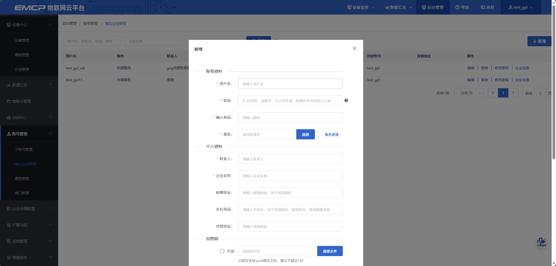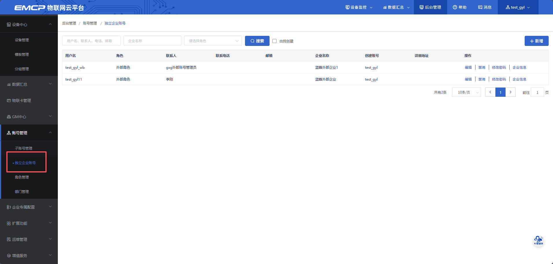 EMCP云平台分配给企业A账号,在此A账号下外部账号B,即账号B是属于企业A的外部账号,有自己独立的设备且企业A的人员不能对这些绑定在外部账号B的设备进行操作或者查看相关信息。即设备绑定在外部账号B下,只能由外部账号B创建的账号进行相关操作(受外部账号权限限制)。但是外部账号不能再进行外部账号的创建和分配,权限相关内容见组织架构使用说明2.3节。