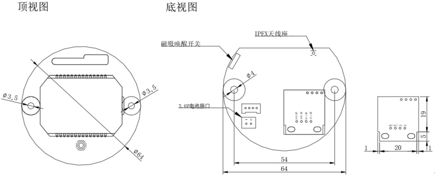 电源接口:供电电压为3.6V,建议选择锂亚硫酰氯电池供电,电池规格为ER34615