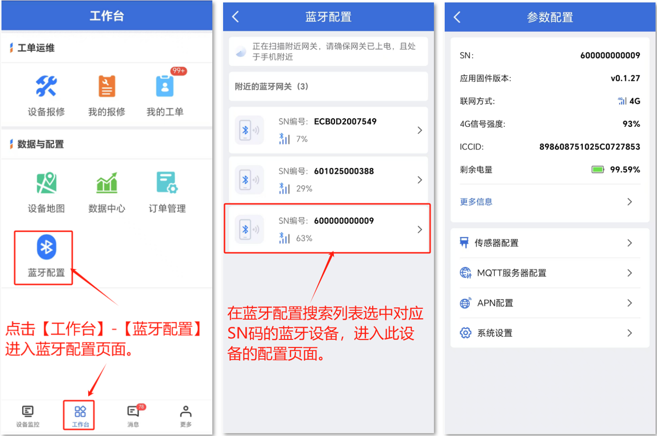 在蓝牙“参数配置”页面可以查询设备的SN码、固件版本、联网方式、信号强度、ICCID(物联网卡号)、剩余电量。已经对传感器、MQTT服务器、APN、系统设置等。