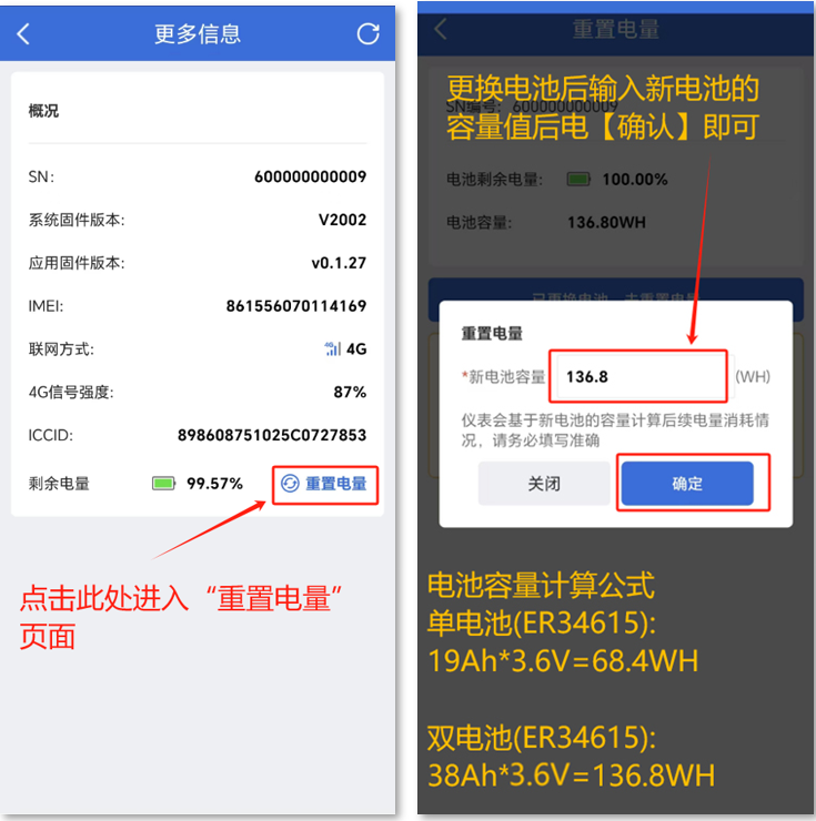 重置电量:如电池没电并更换电池后,务必要通过“云联物通”APP→进入蓝牙配置,在“参数配置”页面点击【更多信息】进入下图“更多信息”页面,在点击【充值电量】文字按钮进入“重置电量”页面,按图中容量计算公式填入对应的“新电池容量”,点击【确认】即可完成新电池的更换工作。