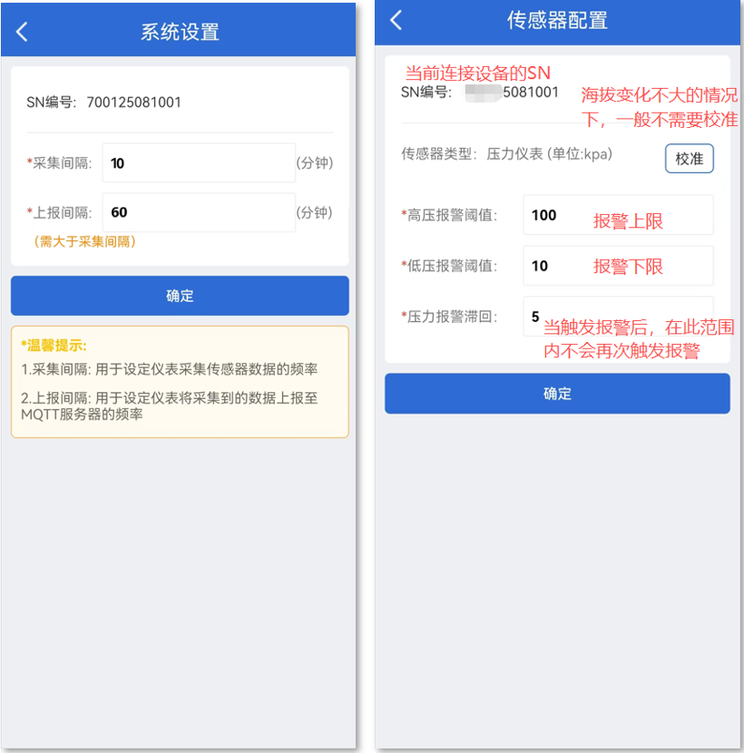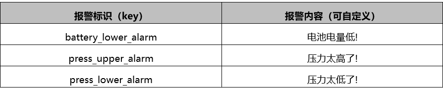 压力报警滞回:当触发报警后,采集数值在此范围内不会再次触发报警。举例:当设置的高压报警为100,滞回为5,则在第一次触发报警后,采集数据在100-105之间不会再次触发报警。【高压报警阈值】:压力高于此处设置即触发报警。