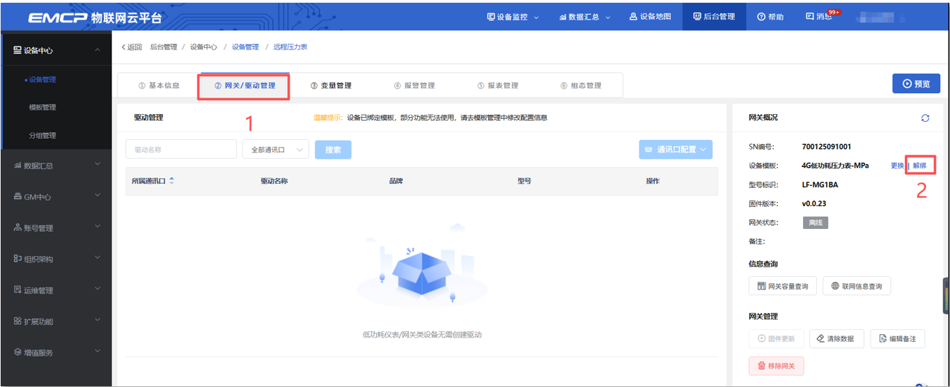 使用账号登录电脑网页端(www.lfemcp.com)→后台管理→找到自己的雷达液位计→点击编辑→点击②网关、驱动管理→点击解绑。