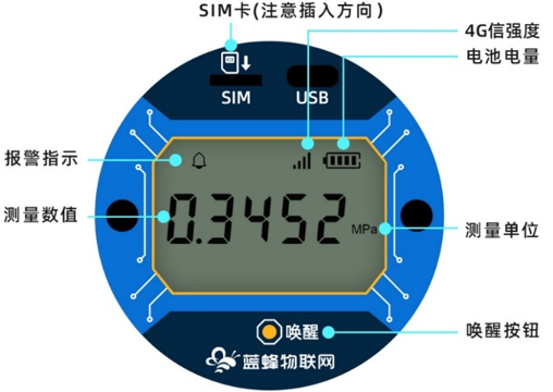 唤醒按钮:可将仪表从休眠状态唤醒,唤醒后仪表会工作1分钟,默认间隔10秒采集并在屏幕上刷新和上报平台数据。