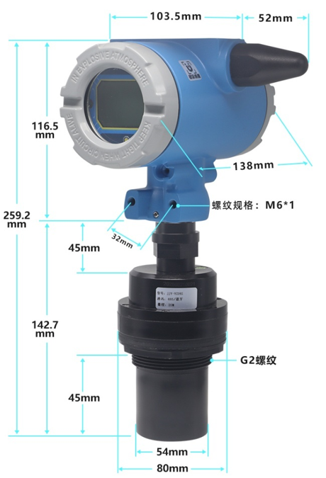 最小盲区:为仪表测量端面到液面最小的识别距离。如果超出则测量值只显示最大高度(即安装高度)。