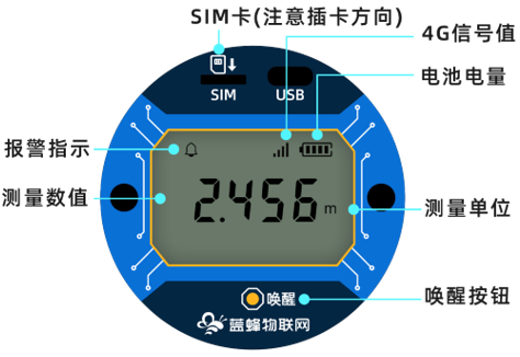 注意:手动“唤醒”主要用在调试阶段,手动激活设备查看当前测量值和状态。唤醒分“唤醒按钮”和“磁吸唤醒”(通过强力磁铁置于其上即可唤醒仪表),唤醒后显示屏数显内容会闪烁5秒(启动系统)此时表明已唤醒成功。唤醒后仪表会工作1分钟,默认间隔10秒采集并在屏幕上刷新和上报平台数据。