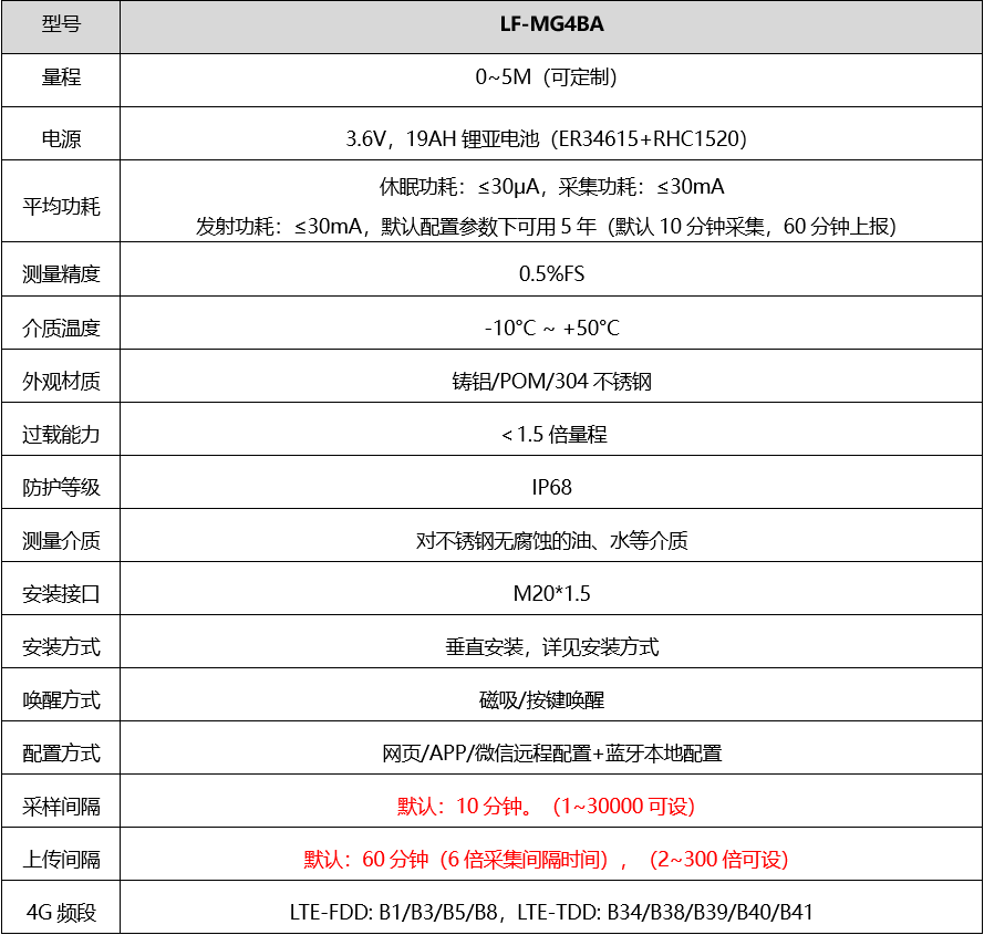 电池工作年限: 19AH(1节ER34615+RHC1520)电池不低于5年(10分钟采集/1小时上报/信号强度>50%/使用温度>-10℃条件下),缩短采集和上报时间会降低电池使用时长,反而会延长时长。