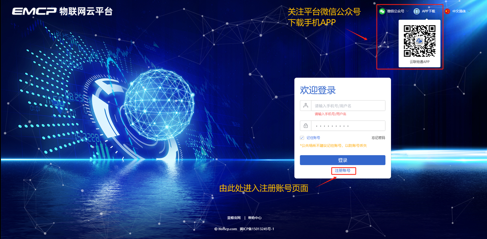 4G投入式液位计默认使用模板组态进行展示,如果更改展示样式,可通过EMCP平台自行编辑组态画面。通过电脑网页打开EMCP平台网址:www.lfemcp.com,凭账号登录平台。