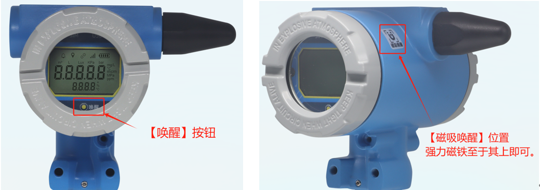 按钮唤醒:逆时针拧下远传仪表前盖,在面板中下方点击【唤醒】按钮即可。