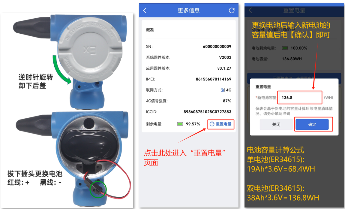 更换电池后,务必要通过“云联物通”APP-进入蓝牙配置(按上8.2说明),在“参数配置”页面点击【更多信息】进入上图“更多信息”页面,在点击【充值电量】文字按钮进入“重置电量”页面,按图中容量计算公式填入对应的“新电池容量”,点击【确认】即可完成新电池的更换工作。