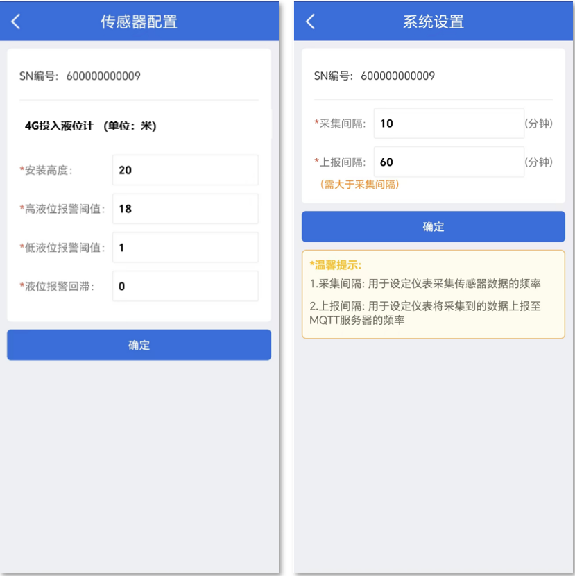 注意:采集间隔/上报间隔采用默认即可,间隔时间设置越长电池使用寿命越长,相反则电池使用寿命越短,设置要求:上报间隔≥采集间隔,上报间隔≤采集间隔×200。