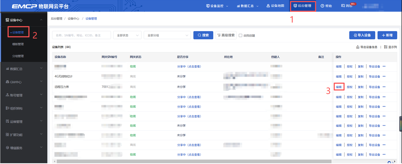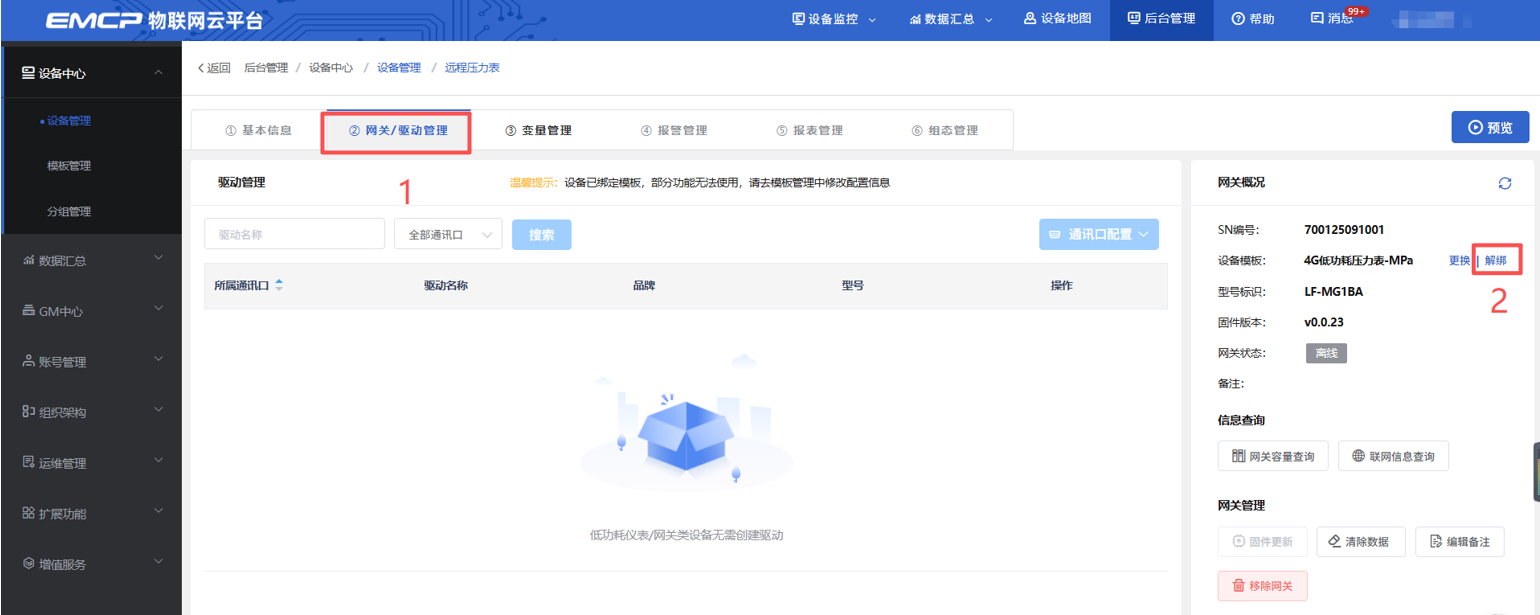 使用账号登录电脑网页端(www.lfemcp.com)→后台管理→找到自己的雷达液位计→点击编辑→点击②网关、驱动管理→点击解绑。注意:解绑以后不要修改③变量管理,④报警管理,⑤报表管理。