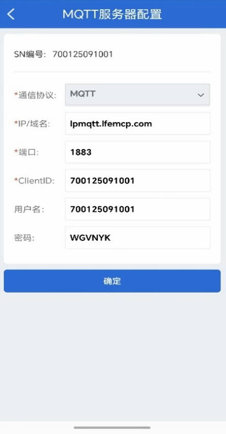 用户名/密码:连接MQTT服务器的身份标识,出厂默认为设备SN码和验证码。(这两个参数为平台方提供)。