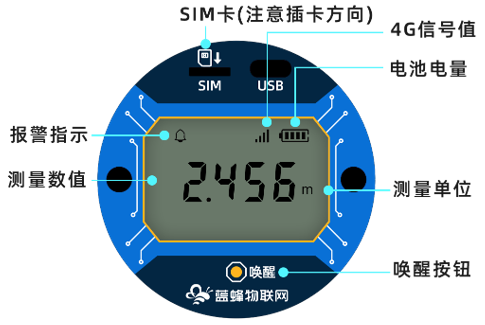 注意:手动“唤醒”主要用在调试阶段,手动激活设备查看当前测量值和状态。唤醒分“唤醒按钮”和“磁吸唤醒”(通过强力磁铁置于其上即可唤醒仪表),唤醒后显示屏数显内容会闪烁5秒(启动系统)此时表明已唤醒成功。唤醒后仪表会工作1分钟,默认间隔10秒采集并在屏幕上刷新和上报平台数据。