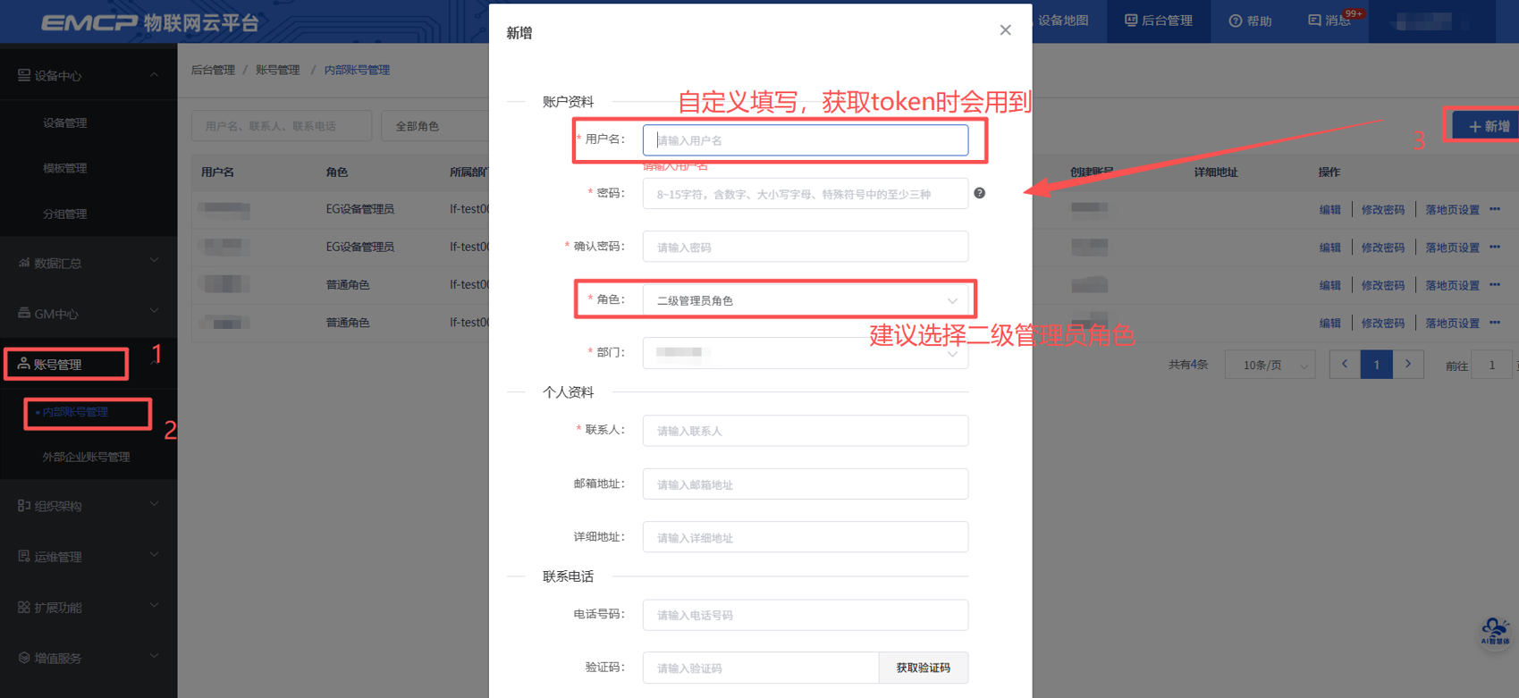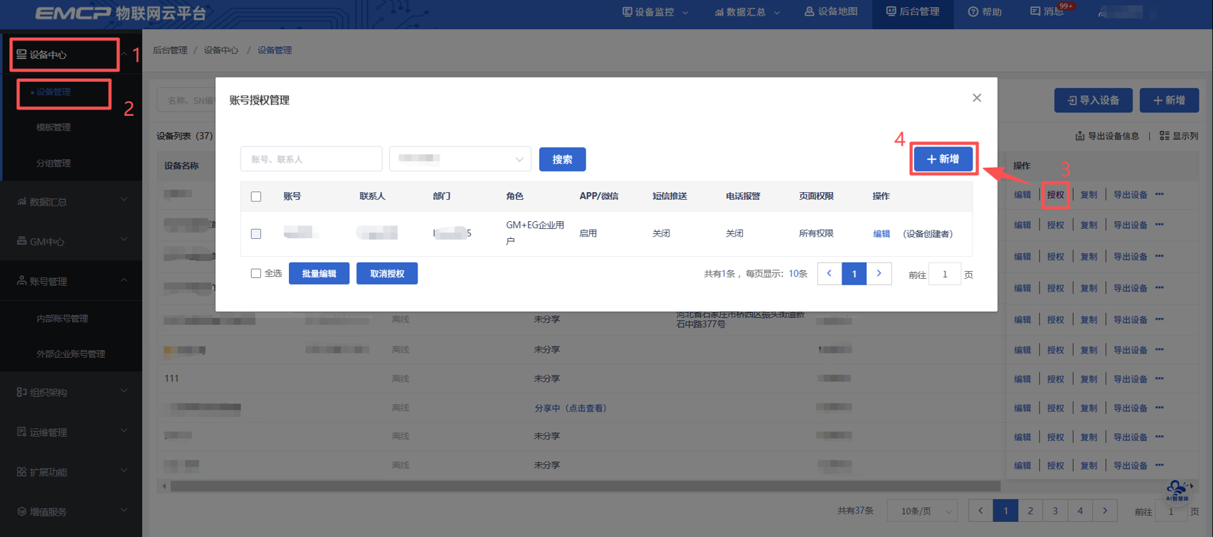 步骤3、步骤3、使用EMCP物联网云平台企业账号,在账号管理中建立一个内部账号(此账号专门用于调用API接口),并将需要使用API调用数据功能的设备授权给该内部账号。