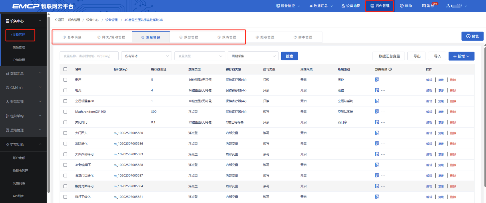 步骤2、使用企业账号登录EMCP物联网云平台的后台管理,在“设备管理”中新增设备,保证能够正常采集和查看对应设备的数据(驱动、变量、报警、报表等)。