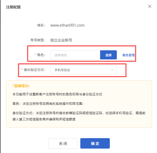 【注册账号链接】点击启用后,可以在登录页面开启注册连接,开启的前提是,需在“注册配置中”,设置注册账号的角色和身份验证方式,如下图 ,具体操作步骤可见:https://help.lfemcp.com/f495/24b6/ec6f