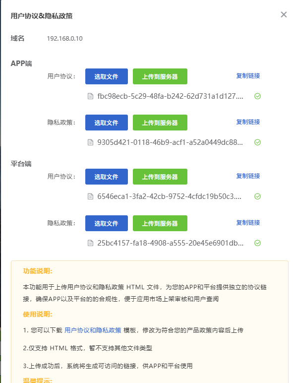 【用户协议&隐私政策】用为APP端和平台端(PC端)分别上传独立的用户协议和隐私政策HTML文件,生成可访问的专属链接。满足应用市场上架审核要求,确保用户在使用APP或访问平台时能够便捷查阅相关法律文本,保障产品合规性。如点击启用,需要点击右侧“设置”按钮进行配置,如下图,具体操作步骤可参考:https://help.lfemcp.com/f495/24b6/a715